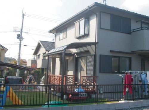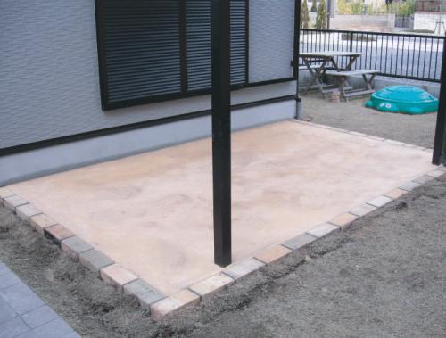 テラスの土間はかわいらしくレンガで縁取りをし、カラクリートで仕上げました