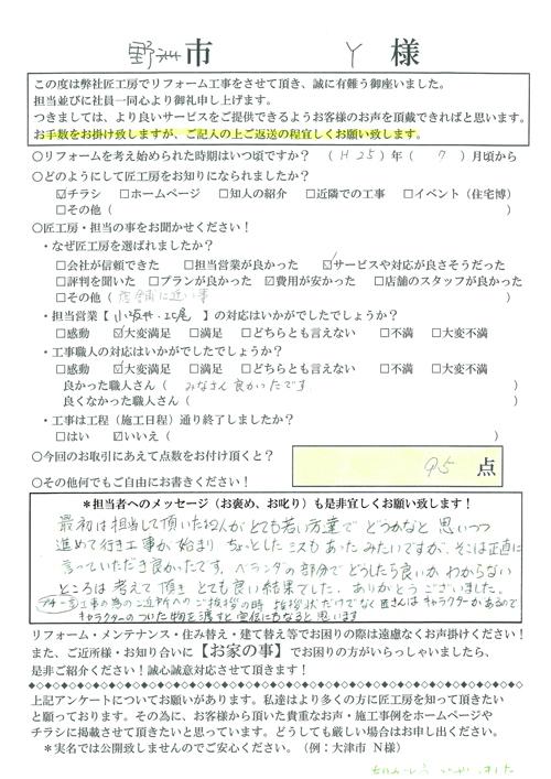 いつも笑顔のお客様にこちらが元気を頂いていました。店舗の近くに住まわれていらっしゃるので、すぐに状況確認が出来、よく進行状況は見させていただきました。1番目立っていた帯部分の劣化も綺麗になって満足ですと言って頂けた事、とてもうれしかったです。