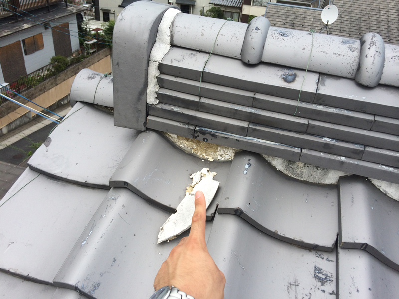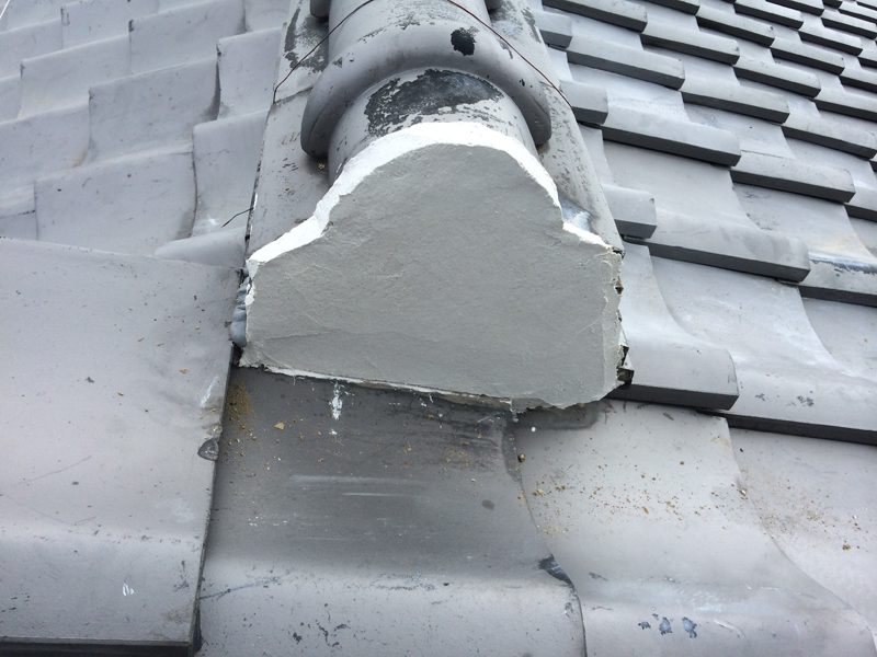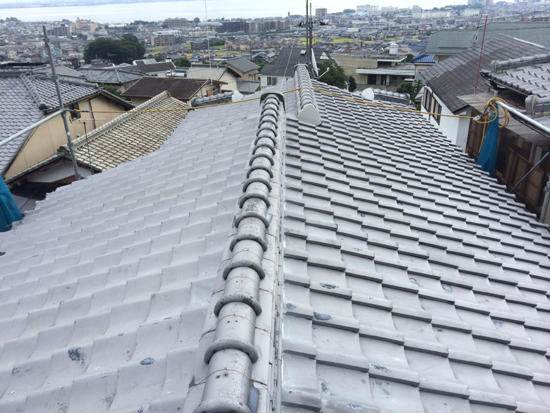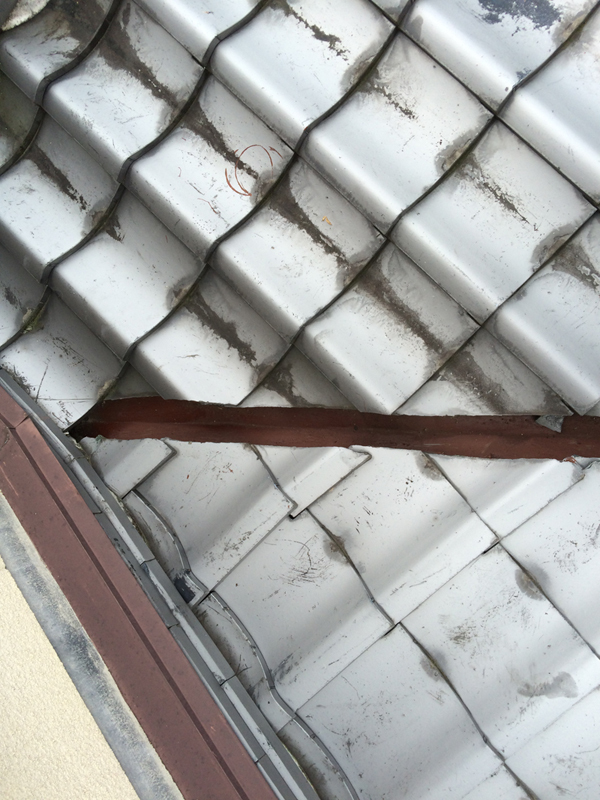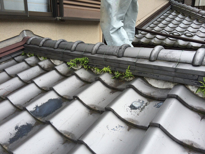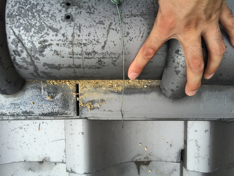 | 工事内容 | 1階の屋根を点検させていただいたタイミングで、2階の屋根も点検させていただきました。 雨漏れの原因と思われる箇所は、棟瓦と谷板金と呼ばれる箇所でした。2階の屋根から落ちてくる雨水が樋で受けきれず、オーバーフローして棟瓦に当たり続けていて、中の土に水がしみこみ、草が生えていました。 一旦瓦を外し、積み直して漆喰で固めました。 また、2階の屋根の方は漆喰が取れている箇所が多数見受けられたので、塗りなおりをし、棟瓦のずれを直し、切れていたワイヤーを直すなどして、きちんとメンテナンスをしました。 |