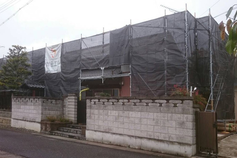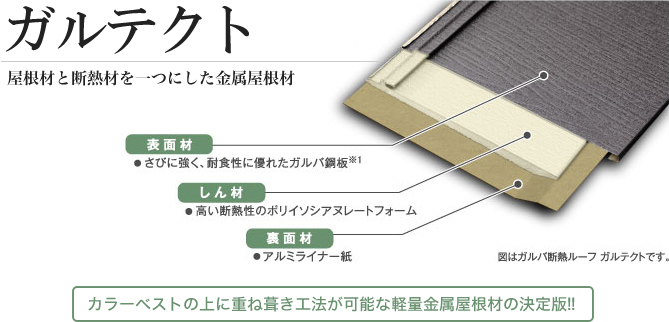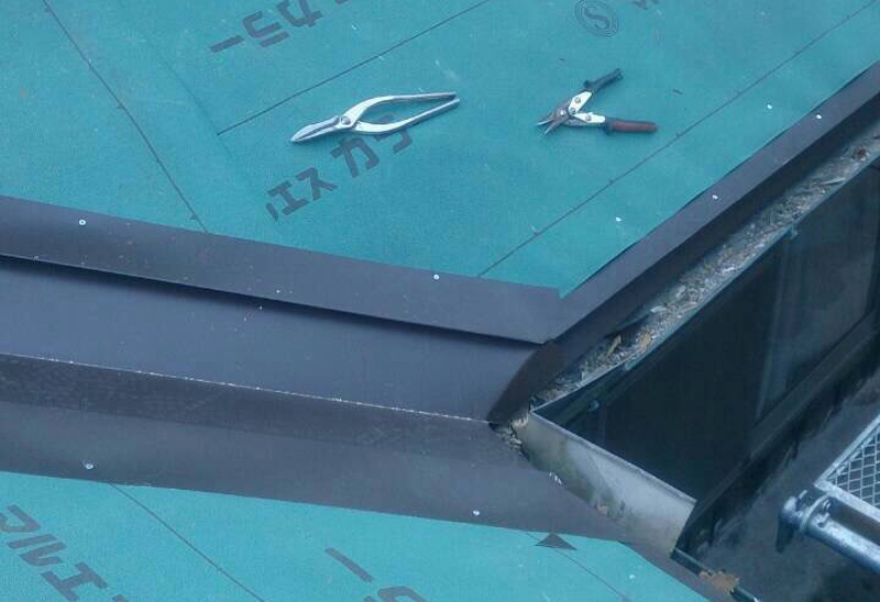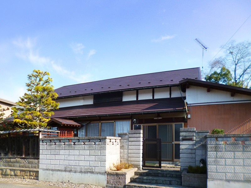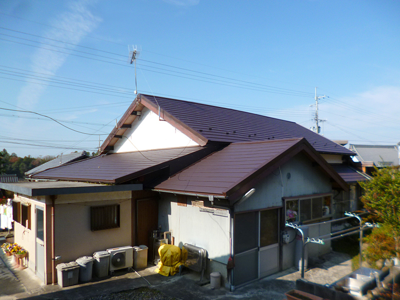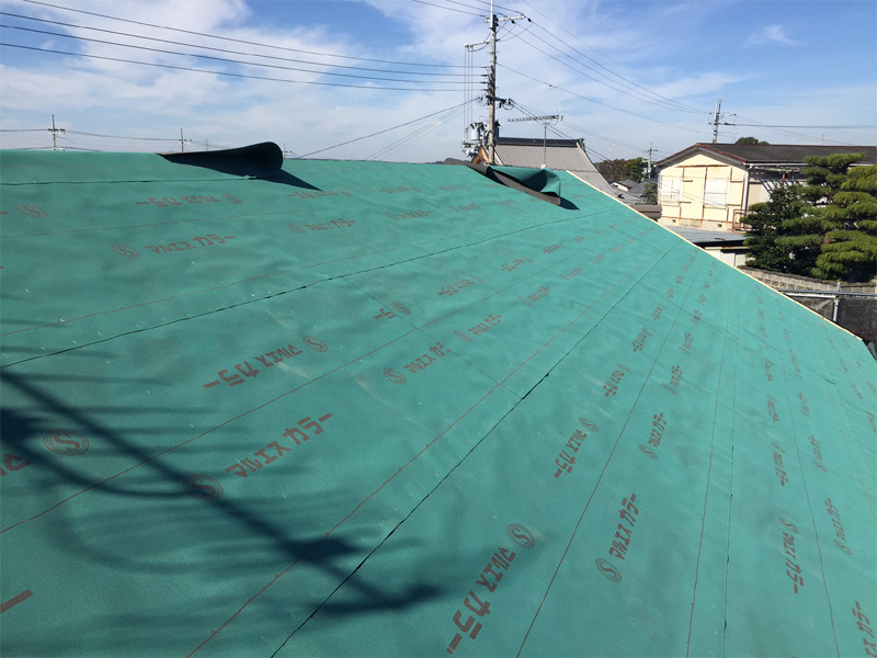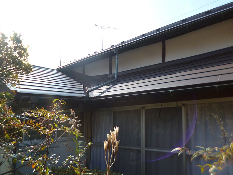 | 工事内容 | 調査をさせて頂いた時点で、雨漏れが確認できましたので工事までの期間は一旦、雨養生を行いました。 また既存屋根材を撤去したのち、屋根下地のチェックを行い、劣化が著しい箇所は大工により補強を行いました。 その後、防水シートを施工し、屋根材は断熱材入りの金属屋根(ガルテクト)を新たに施工しました。 |