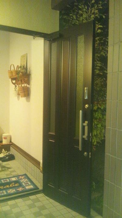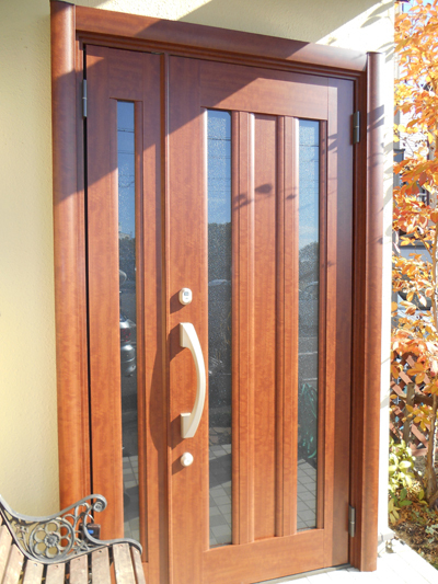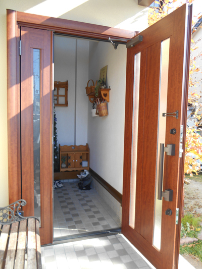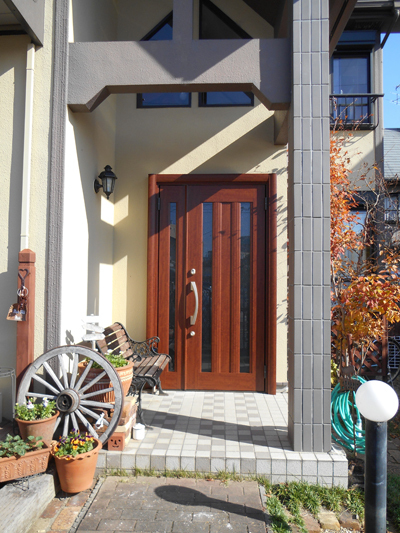 玄関ドアはリフォーム用のドアで施工も1日で終わりました。木目調の良い色合いで、おしゃれな玄関に仕上がり、防犯性能も大きく向上しました。