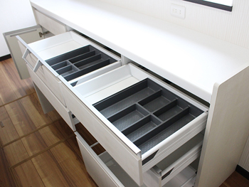 | 引き出しが大きく出て収納はたっぷり入ります!! | 後ろのカップボードも収納たっぷりです |