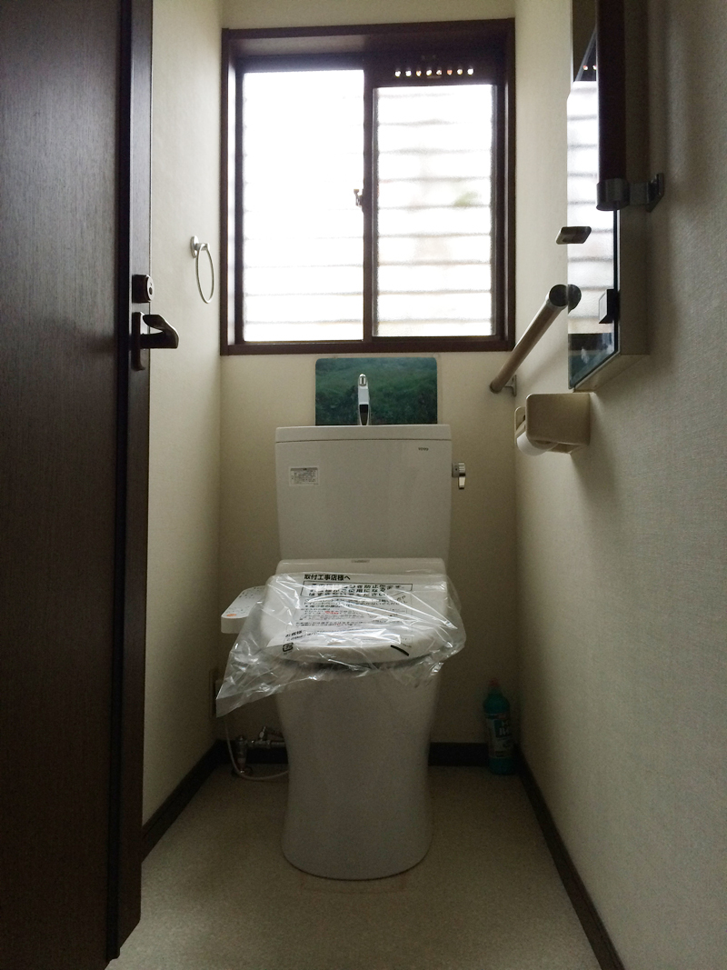 | 工事内容 | 窓枠に貼ってあるシートが剥がれてきているということだったので、大ノックシートというものをはらさせていただきました。また、便座の交換をさせてもらう予定でしたが、水道屋さんに見ていただいたところ水漏れがしているということだったので、トイレ本体の交換を提案させていただきました。また、フローリングにワックスをかけていただきました。電気ボックスがない箇所があったので新設させていただき、フロアコンセントに既存と同等品と交換させていただきました。賃貸で貸すために煙探知機も設置させていただいています。 |