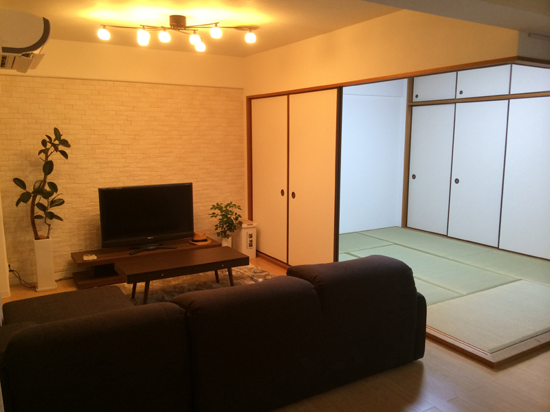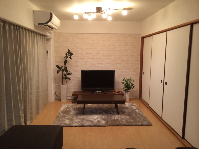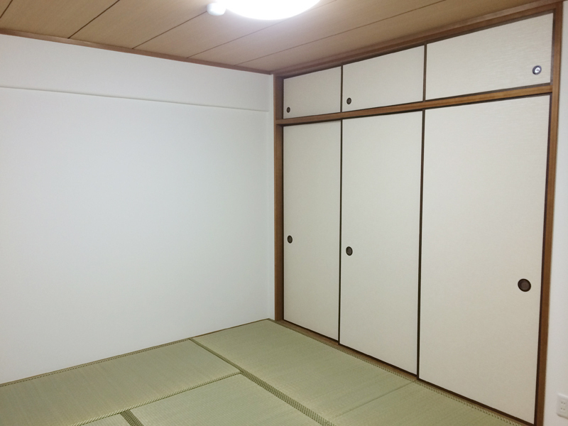 | 工事内容 | 今回はお引越しをされる前の工事でしたので、工事を一気に進める事が出来ました。 内容はお風呂・洗面台・トイレ・給湯器の交換、カーペットからフローリングへ張替え、全室クロス・クッションフロアの張替え、畳表替え、襖の張替え、内窓の取り付け、鍵の交換、エコカラットの貼り付け、カウンターの表面シート張りなどなど、お部屋のほとんど全てをきれいにしました。 |