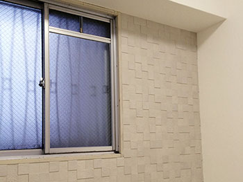 部屋を使うので綺麗にしたいとの事でお問合せをいただきました。空気の流れが悪く、湿気が溜りやすい部屋の角部分にカビが発生していて気になされていました。壁紙を張り替える事を考えられていましたが、今後また同じ事になってくるので何か対策はないのかとの事。そこでエコカラットというタイルの出番です。タイルはタイルでも調湿効果のあるタイルで、カビの発生原因の一つである湿気を緩和しカビを発生しにくくする環境を作りました。またお部屋のアクセントとしても活躍してくれ、オシャレ度UPのお部屋になりました。床にはカーペットを上張りしました