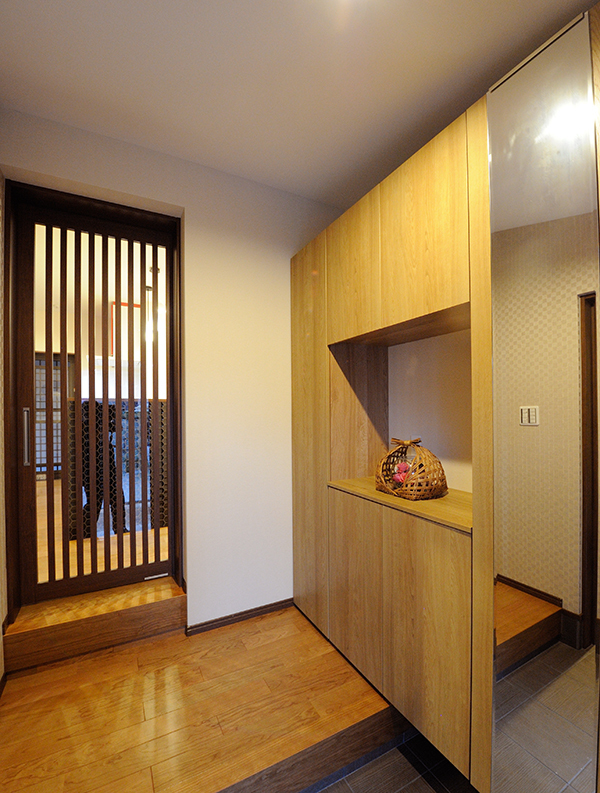LDKの一部を吹き抜けにすることにより、採光を取り入れました。ウォークインクロークを通ってLDKへ行けるようにしたので、玄関がいつもきれいに保てます。2階の子世帯も使いやすいように階段近くに水廻りを集約しました。駐車場から直接LDKに入る勝手口を作ったことで、お買い物後など雨が降っても濡れずに室内に入れます。 |