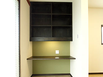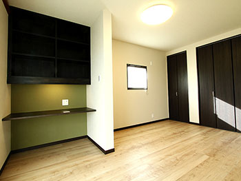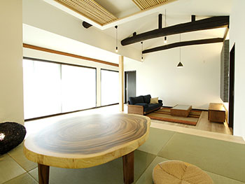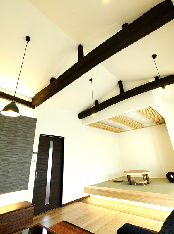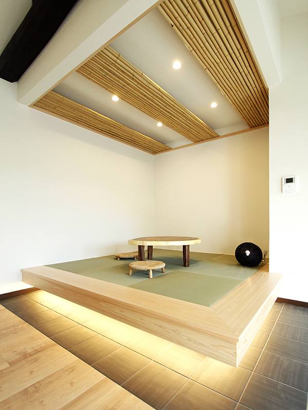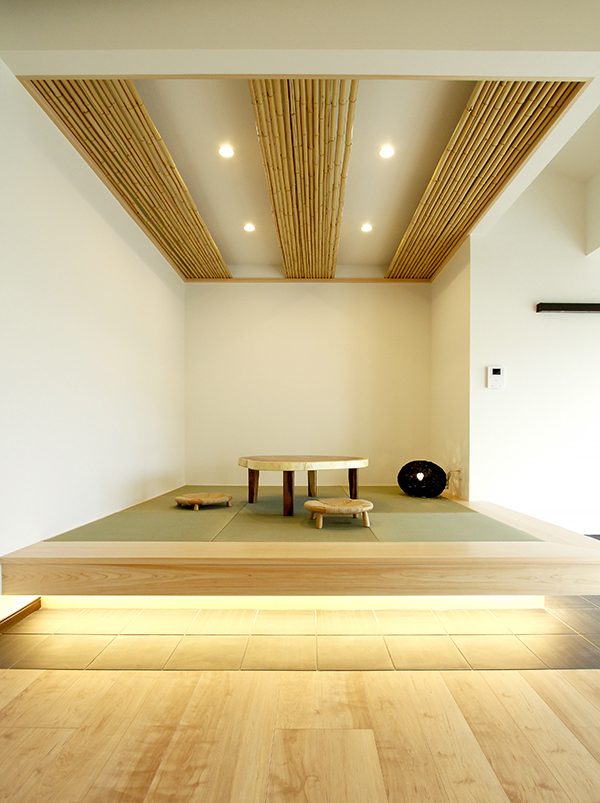 日当たりのよい南側にリビングと寝室を計画し、明るく暖かいお部屋になりました。 一段小上がりにした畳コーナーの框下に間接照明を入れて、空間のシーン分けをしました。 畳コーナーの天井部分にはもともとご実家が竹屋さんを営んでおられた時の竹材を採用し、アクセントにしています。 寝室には書斎コーナーを設けています。 トイレ背面にも竹を再利用し、間接照明を入れています。 |