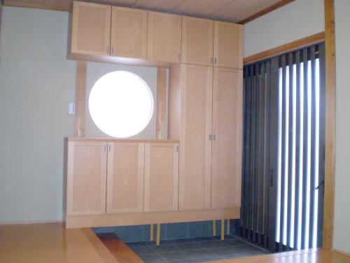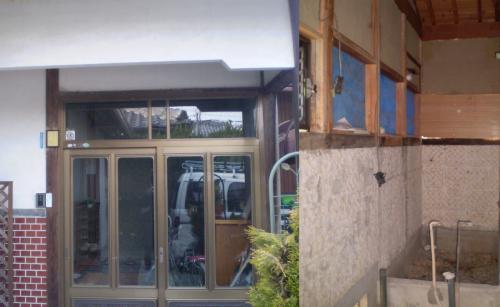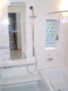 | 工事内容 | ?@お風呂は1坪タイプが入るように既存の屋根内の可能な範囲で増 築しました。ユニットバスは今最新のTOTOのスプリノシリーズ!?A洗面所・トイレの壁は湿気に強いものを!ということで鏡面パネ ルを全面に貼り、とても清潔感あふれる空間にしました。?B玄関は重厚な和のイメージを残しつつ、洋風の要素も取り入れま した。既存の丸窓が良いアクセントになっています。 この丸窓も外から見えないようにガラスフィルムを貼りました。 |