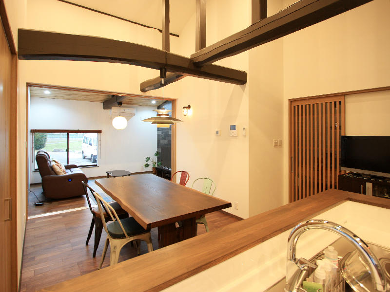 8畳のダイニング・キッチンから廊下・玄関・土間スペースを一つの空間にして、対面キッチンの広々としたLDKを提案しました。 |