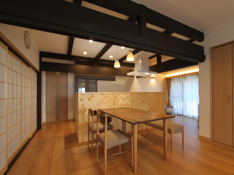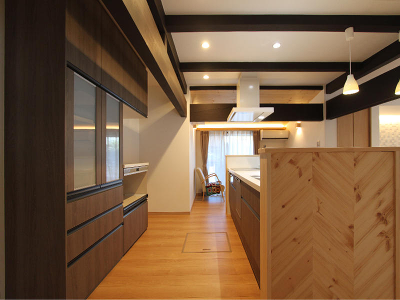 | キッチン・ダイニング | キッチン前のこし壁にも羽目板 |