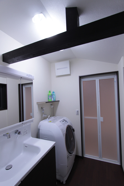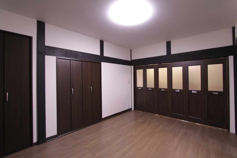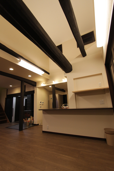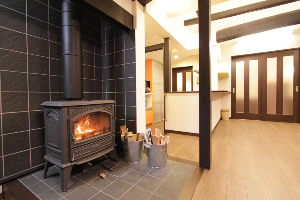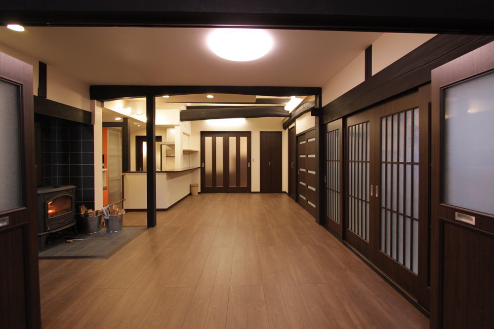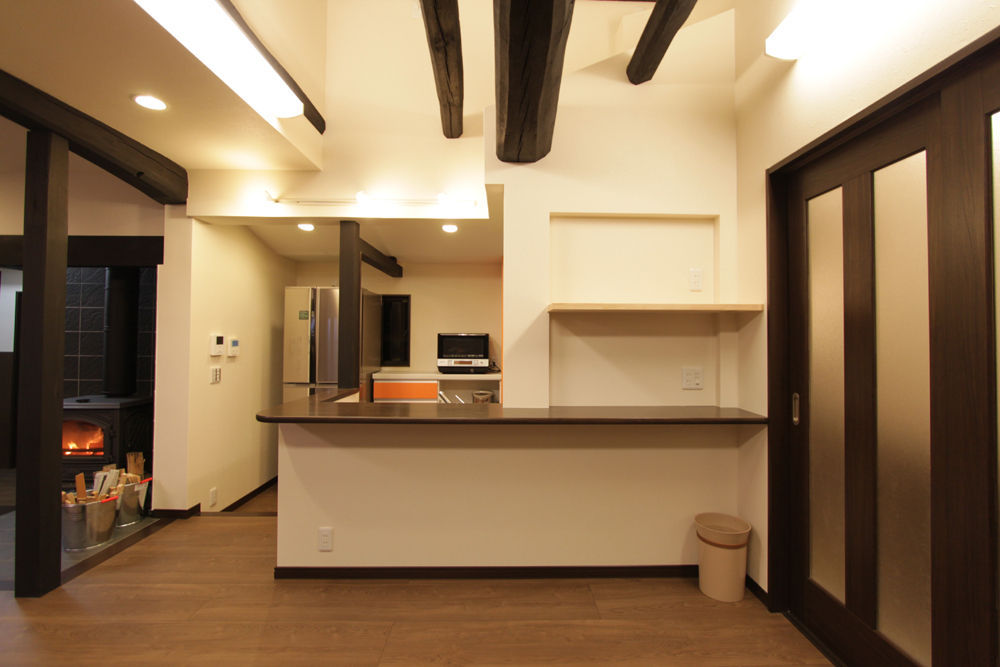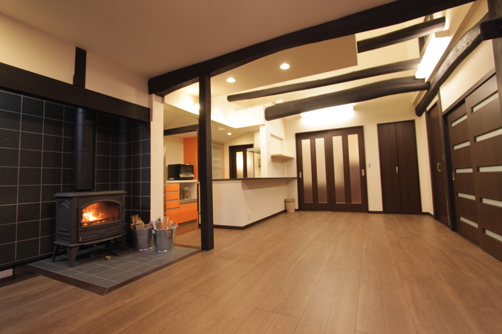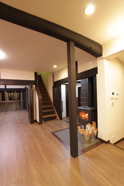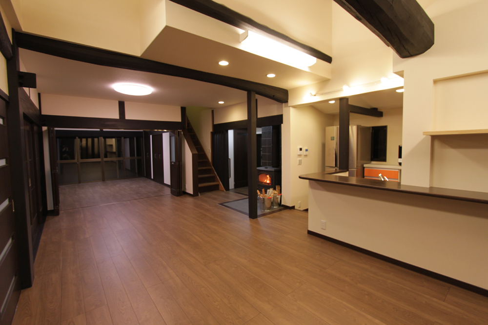 | 工事内容 | まず耐震補強については、床レベルを合わせたり、天井材を交換する目的もあって、床や壁、天井をめくった際に耐震金物で補強しました。必要工事の中で最大限効果を出す方法です。また、薪ストーブ用の空気の流れを考慮して物置になっている二階を一部改装し、大きな吹き抜けを作りました。そして暖気は上部にあがる性質があるので、後々利用するであろう吹き抜け空間に隣接する壁に窓を二つ設けて、暖気の循環を良くしました。 内装はベージュ系の壁紙で演出し既設のおおきな梁はアクセントで黒のベンガラで塗装して空間を引き締める効果を出しました。 |